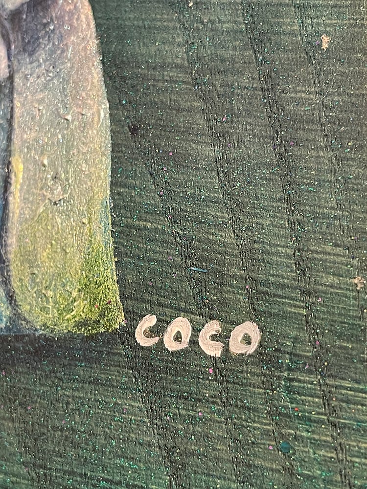 こちらの作品は生ライブ配信で描かれた作品です。視聴者の方からその日が月が満月だという情報を元に、cocoくまを描く予定が満月とお地蔵さんを描く事になった作品です。