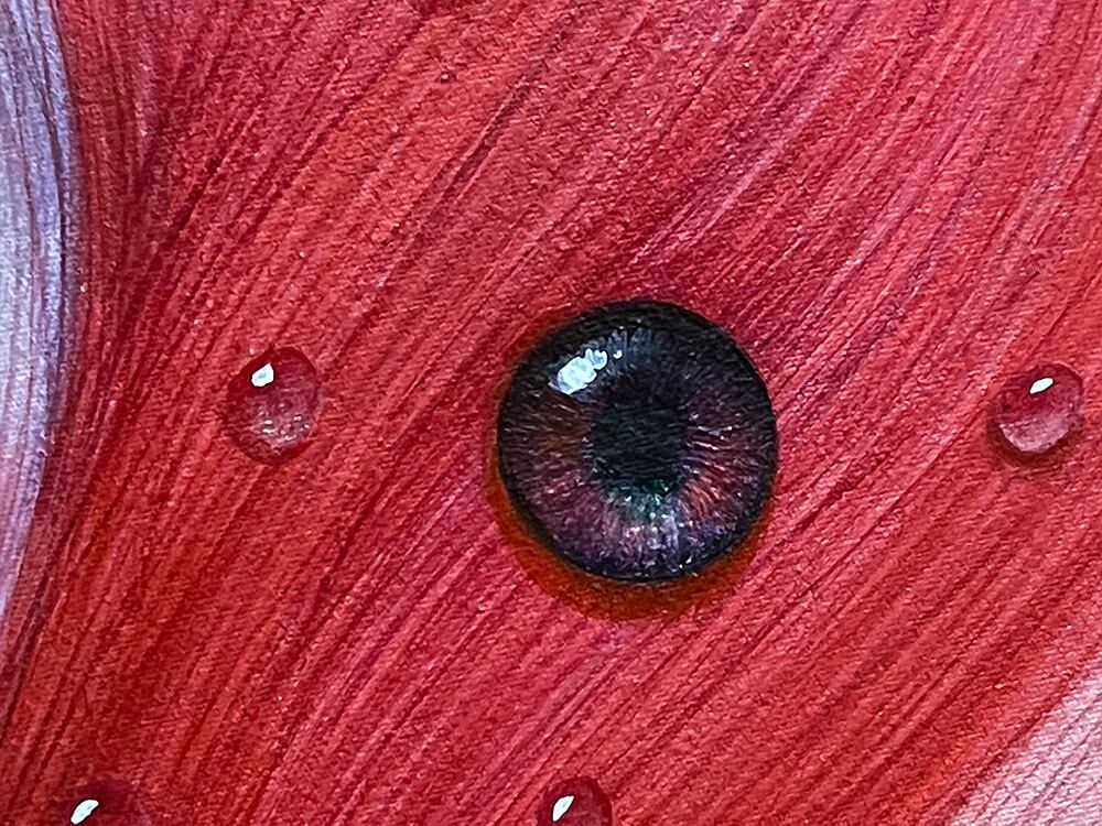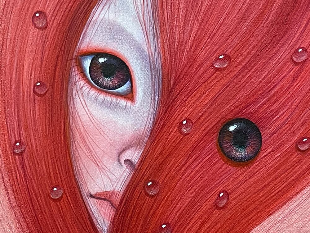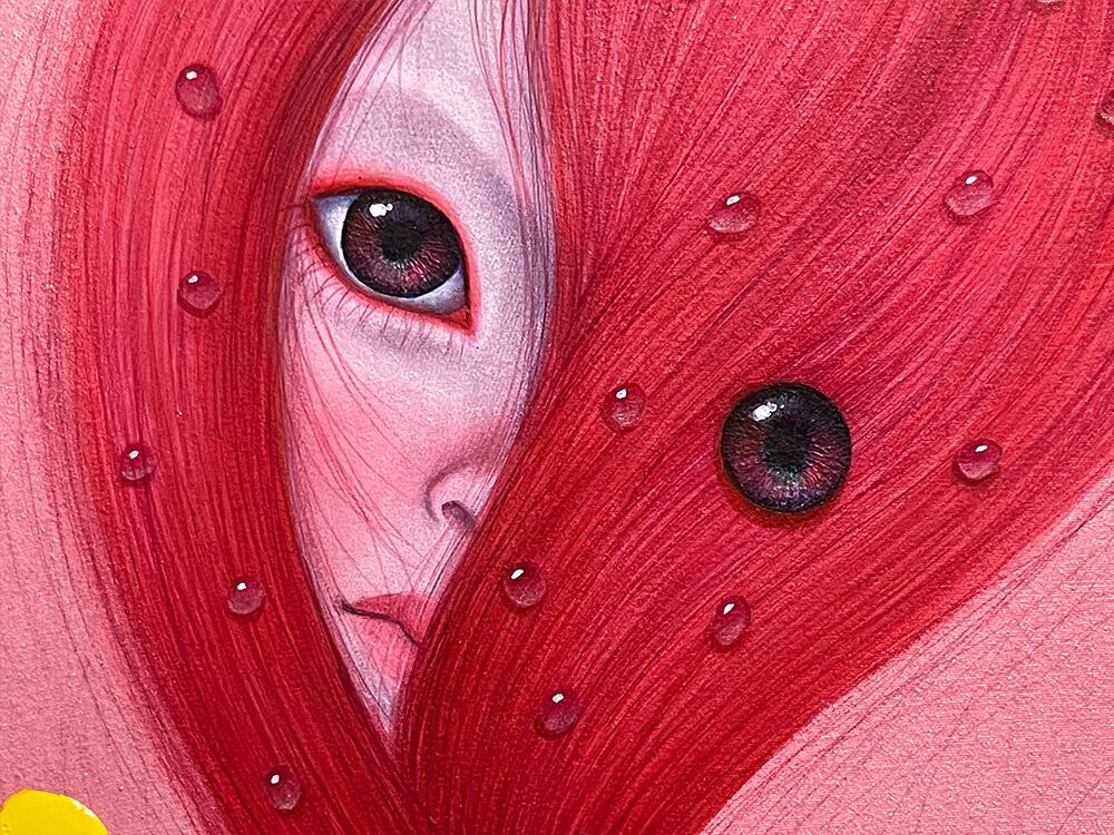 髪は滴る赤、一滴の生命を象徴する雫として形作られ、その動きは止まることなく流転し続ける。無意識に繰り返される「生きる」という行為—呼吸、瞬き、鼓動—は日常の習慣となり、時に意識の外へと追いやられる。しかし、それこそが私たちを「生きている」と証明する行為の集合体で、髪型の雫の形状は、生命の儚さと永続性の二面性を象徴しています。
